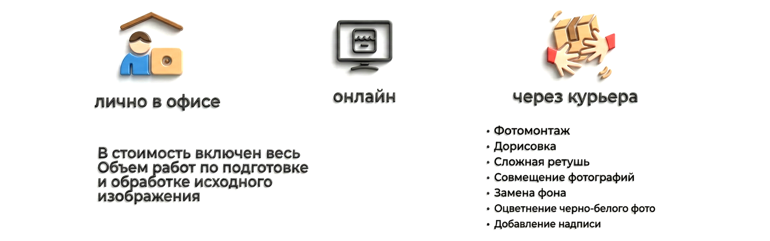 Мы занимаемся производством с 1998 года. За это время технологии значительно продвинулись вперед, поэтому мы гарантируем долгий срок службы всей нашей продукции. Предлагаем обилие форм и размеров. Мы внимательно относимся к каждому заказу, фото корректируется художником-оформителем. По запросу можем профессионально отредактировать доставленную фотографию — изменить фон, удалить ненужные объекты, раскрасить черно-белую фотографию, отретушировать дефекты, исправить сильно поврежденные изображения и многое другое..